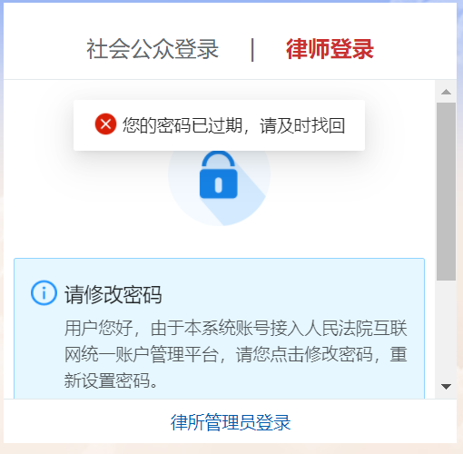 a、若律师手机号已注册过人民法院互联网统一账号管理平台对接的其他平台(保全、庭审公开网、文书公开、鉴定、微法院、12368等),可直接使用统一账号密码登录;若忘记密码,重置账号密码即可,其他平台的密码一并改变。