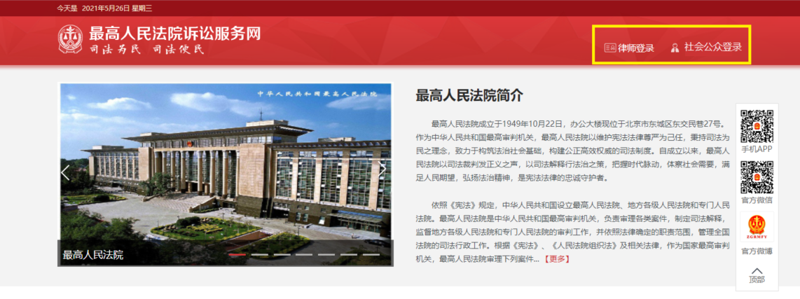 用户打开最高人民法院诉讼服务网网站(http://ssfw.zwitit.com/),点击页面右上角“律师登录”或“社会公众登录”按钮,进入登录页面。